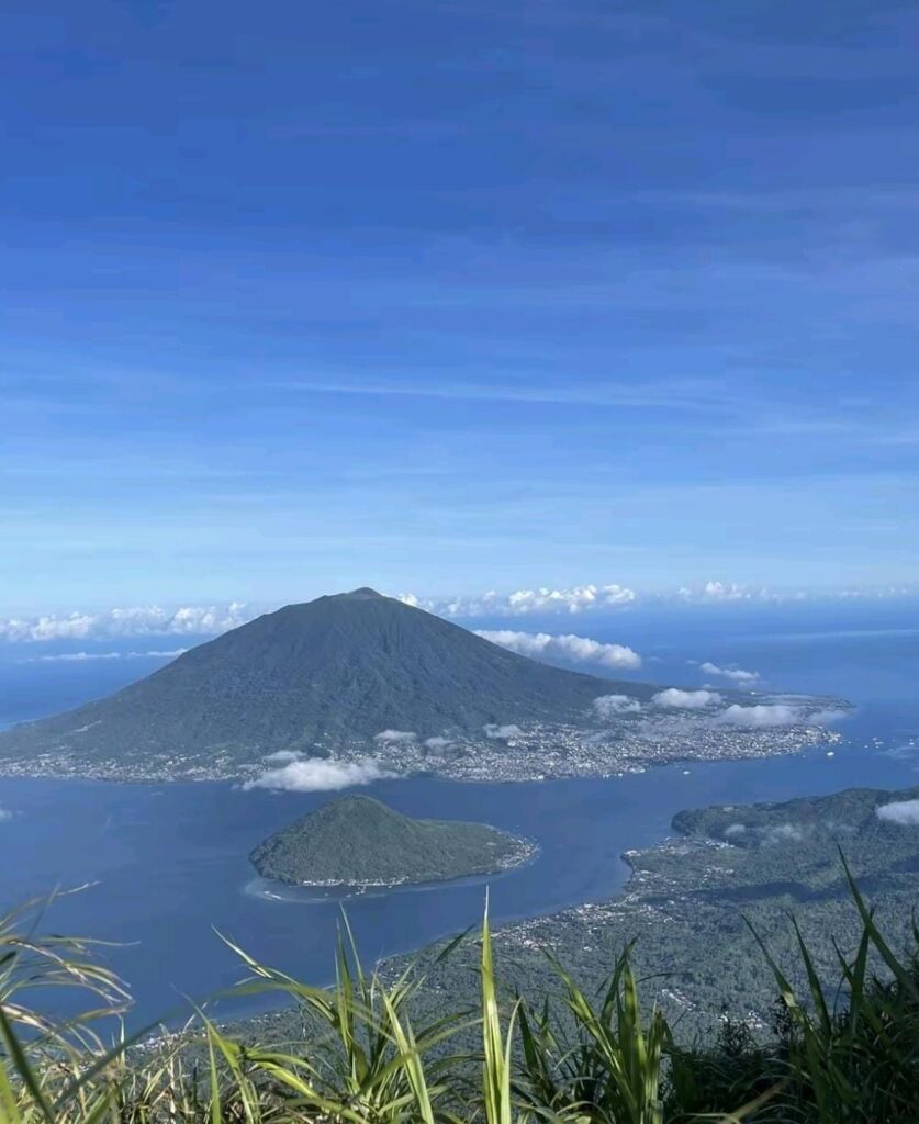 Ketika mencapai puncak, semua lelah seolah hilang. Dari ketinggian, kamu bisa menyaksikan Pulau Maitara dan Ternate tampak kecil di kejauhan, dikelilingi laut biru yang berkilau di bawah sinar matahari. Kalau cuaca sedang cerah, matahari terbit dan terbenam di sini terlihat sangat memukau — momen yang membuat banyak pendaki tak berhenti berdecak kagum.