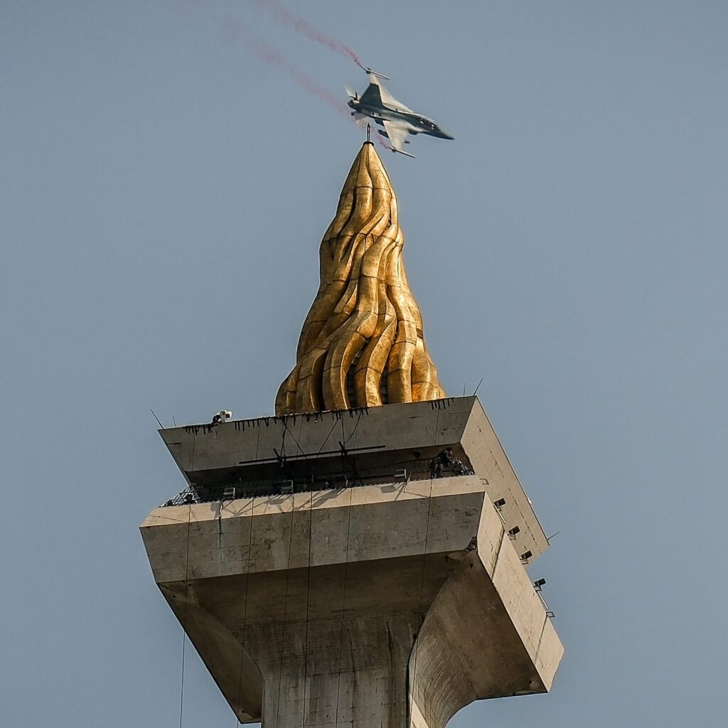 Hal yang paling mencolok dari Monas tentu adalah “Lidah Api” berlapis emas di puncaknya. Api ini melambangkan semangat perjuangan yang tak pernah padam. Menariknya, lapisan emas di bagian atasnya mencapai 50 kilogram, membuat Monas tampak berkilau indah saat terkena sinar matahari terutama di pagi dan sore hari.