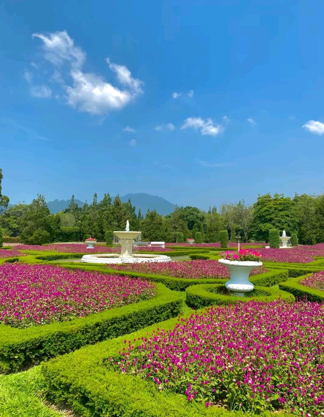 Kamu akan disambut oleh menara pandang tinggi yang memungkinkan pengunjung melihat keseluruhan taman dari atas. Dari sini, kamu bisa melihat keindahan taman yang tertata rapi dan berwarna-warni seperti lukisan hidup.