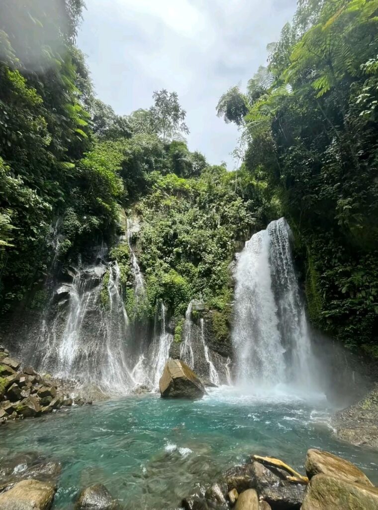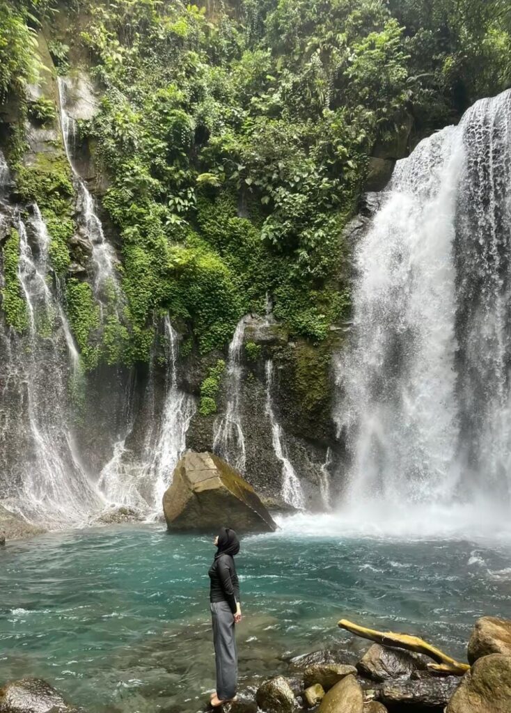 Sesampainya di tempat, rasa lelah langsung hilang tergantikan oleh keindahan air terjun setinggi sekitar 30 meter yang jatuh deras di antara tebing batu alami. Di bawahnya terbentuk kolam jernih berwarna kehijauan yang menenangkan mata.
